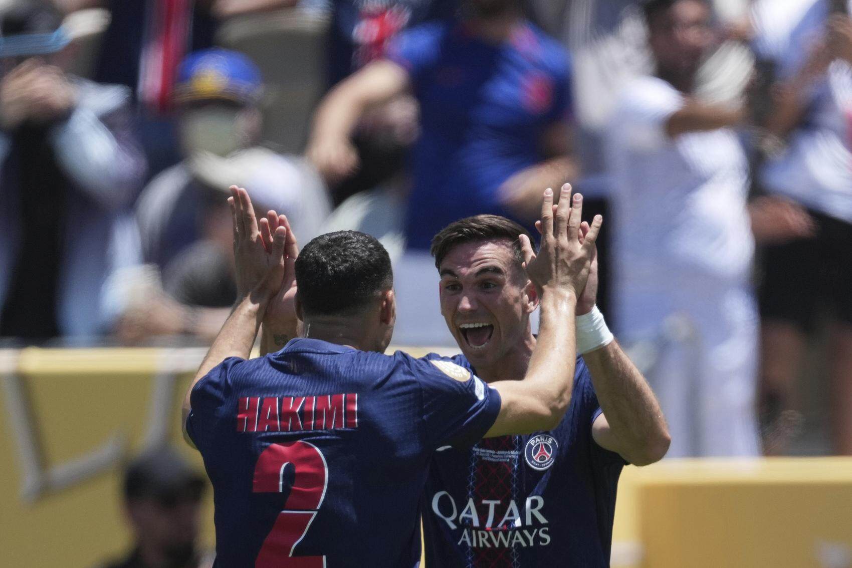 在洛杉矶午后炙热的阳光中,大巴黎无敌中场组合不仅演绎了妙到毫巅的中场控制,还表演了进球能力。第19分钟,大巴黎边锋克瓦拉茨赫利亚在禁区内倚住防守回传大禁区弧顶附近,鲁伊斯跟进射门打进球门死角,为大巴黎先拔头筹。上半场伤停补时阶段,克瓦拉茨赫利亚左路带球内切横传送出第二次助攻,维蒂尼亚小碎步突入禁区低射为大巴黎扩大比分。